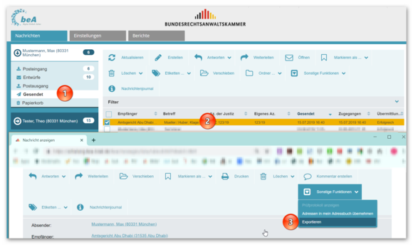 Wechseln Sie in den Unterordner „Gesendet“ (1) und machen Sie einen Doppelklick auf der gerade versandten Nachricht (2). Innerhalb des Nachrichtenfensters wählen Sie unter den „sonstigen Funktionen“ den Befehl „Exportieren“ (3) aus. Speichern Sie die Exportdatei (den ZIP-Ordner) auf Ihrem lokalen System ab (dazu z.B. beA-Newsletter 17/2018).