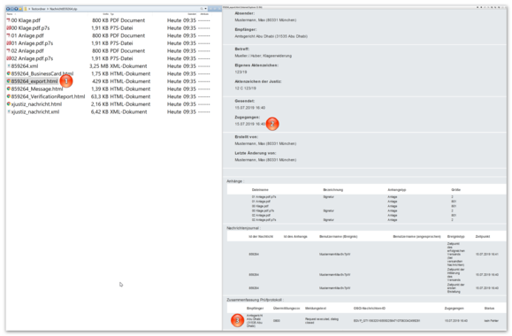 Öffnen Sie die Exportdatei mit einem Doppelklick. Dort finden Sie nun den (in der Entscheidung des LAG Hamm thematisierten) „Sendebericht“ als Datei mit dem Namen „xxxxxx_export.html“ (1). In dieser Datei prüfen Sie, ob das Feld „Zugegangen“ mit einem Datum versehen ist (2). Am wichtigsten ist es allerdings, die Eingangsbestätigung des Justizservers zu prüfen. Hier muss im Rahmen des Ermittlungsstatus „erfolgreich“ bzw. „kein Fehler“ angegeben werden (3).