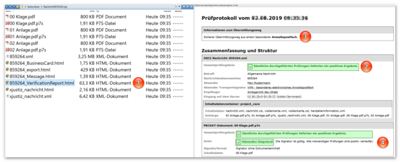 Ist die Nachricht erfolgreich bei Gericht eingegangen, stellt das schon die halbe Miete dar. Jetzt müssen Sie nur (wie in der Entscheidung des OLG Karlsruhe) noch prüfen, ob die Form des § 130a III ZPO gewahrt wurde. Und das machen Sie mithilfe des Prüfprotokolls. Dieses finden Sie unter „xxxxxx_VerificationReport.html“ (1). Achten Sie zunächst auf das Gesamtprüfergebnis zur beA-Nachricht, das eine grüne Markierung haben und auf keinen Fehler hindeuten sollte (2). Finden Sie in der Kopfzeile den Vermerk, dass der sichere Übermittlungsweg aus einem Anwaltspostfach gewählt wurde, der Anwalt also selbst den Versand durchgeführt hat, ist die (prozessuale) Form nach § 130a III Alt. 2 ZPO bereits gewahrt (3).
