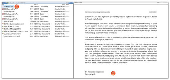 Fehlt der Vermerk, muss unbedingt noch geprüft werden, ob der formbedürftige Schriftsatz über eine gültige qeS verfügt (§ 130a III Alt. 1 ZPO). Suchen Sie dazu das elektronische Dokument in der nachfolgenden Liste. Wurde – wie vorgeschrieben – eine fortlaufende Nummerierung verwandt, dürften Sie es gleich nach der Gesamtprüfung der Nachricht finden (3). Den Dateinamen sehen Sie unter dem Eintrag „Inhaltsdaten“. Das Gesamtprüfergebnis muss hier ein positives Ergebnis ausweisen.