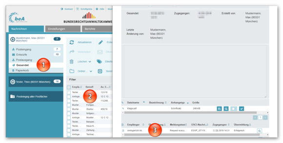 Wechseln Sie in den Ordner „Gesendet“ (1) und machen Sie einen Doppelklick auf die versandte Nachricht (2), um diese zu öffnen. Scrollen Sie in der geöffneten Nachricht nach unten, bis Sie unterhalb der Dateianhänge die Eingangsbestätigung der Justiz mit dem Meldetext („request executed“), dem Eingangsdatum und dem Übermittlungsstatus („erfolgreich“) finden (3).