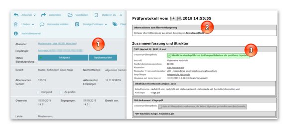 2. Das Prüfprotokoll können Sie ebenfalls über die versandte Nachricht aufrufen. Dazu klicken Sie einfach auf den Button „Signaturen prüfen“ (1). Es werden nun alle Signaturen an der Nachricht gesammelt geprüft und das Prüfergebnis ausgegeben. Besonders relevant ist die Information über die Verwendung des sicheren Übermittlungswegs (2) und das Gesamtprüfergebnis (3), das ein positives Ergebnis ausweisen sollte.