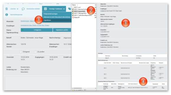 Übrigens: Auch die Eingangsbestätigung der Justiz befindet sich darin eingebettet (4). Der Export von Nachrichten lohnt sich somit, um alle notwendigen Informationen zu sichern.