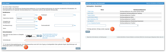 4. Probieren Sie eine Suche gleich mal aus: Suchen Sie unter allen Anwälten in Deutschland. Wählen Sie als Sprache bspw. „Bulgarisch“ (1). Geben Sie den Captcha-Code ein (2) und bestätigen Sie die Nutzungsbedingungen (3). Sie finden nun die Anwälte, die ihren Verzeichniseintrag bereits mit der Sprachkenntnis „Bulgarisch“ gepflegt haben (4).