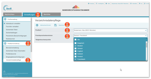 2. Wechseln Sie auf den Reiter Einstellungen (1). Wählen Sie in der Postfachverwaltung (2) den Menüpunkt „Verzeichnisdatenpflege“ (3). Wählen Sie das Postfach des Anwalts aus, dessen Daten Sie im Europäischen Anwaltsverzeichnis pflegen wollen (4). Wählen Sie im Dropdown-Menü, die für den Anwalt zutreffenden Angaben aus (5). Schließen Sie mit „Speichern“ ab (6). Die Übertragung ins Europäische Anwaltsverzeichnis kann einige Zeit in Anspruch nehmen.